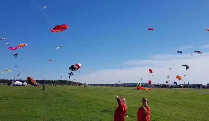 Vom Moderator namentlich angekündigt schmückten die Drachen der JRK-Gruppen mit der bunten Vielfalt der Großdrachen in der Mittagszeit den strahlendblauen Himmel.