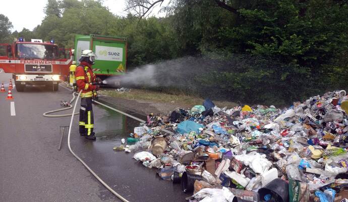 Keltern. Glasflaschen, Konservengläser, Dosen, Kunststoffbecher und -flaschen, Verbundverpackungen von Milch und Saft sowie alle Arten von Metallverpackungen gelten im Enzkreis als Abfallart "rund". Dieser „runde“ Abfall ist am Freitag in einem Müllfahrzeug in Brand geraten, nachdem die grünen Tonnen in Dietlingen geleert worden waren.