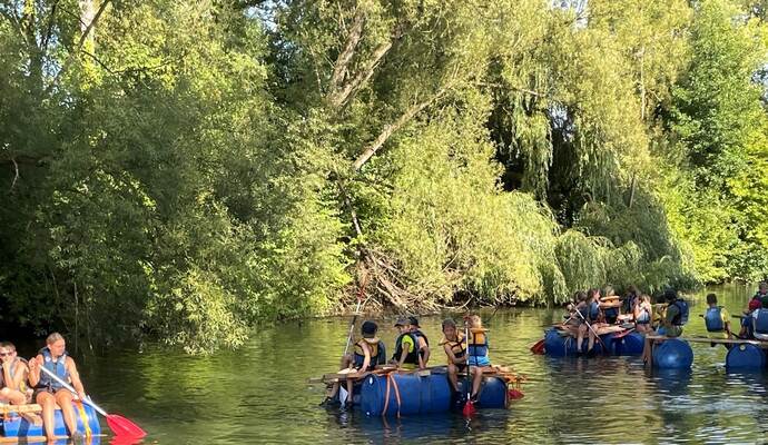 Mit selbstgebauten Flößen auf der Pfinz im Rahmen des Ferienprogramms