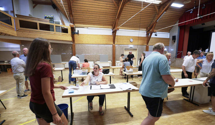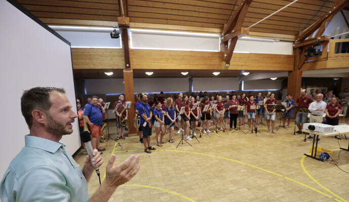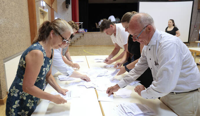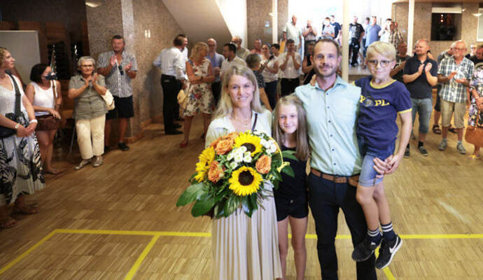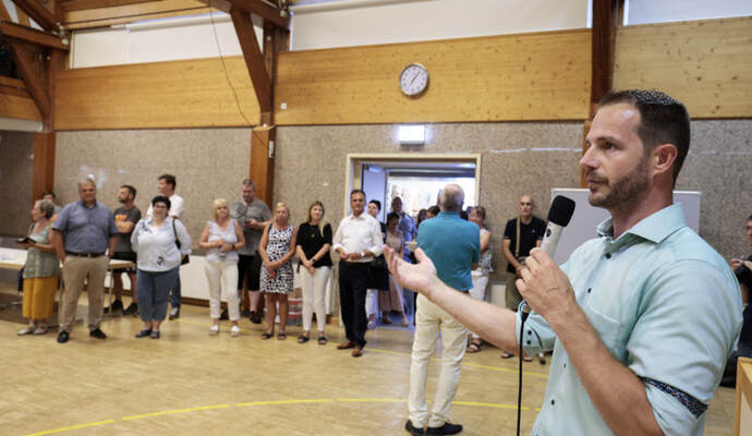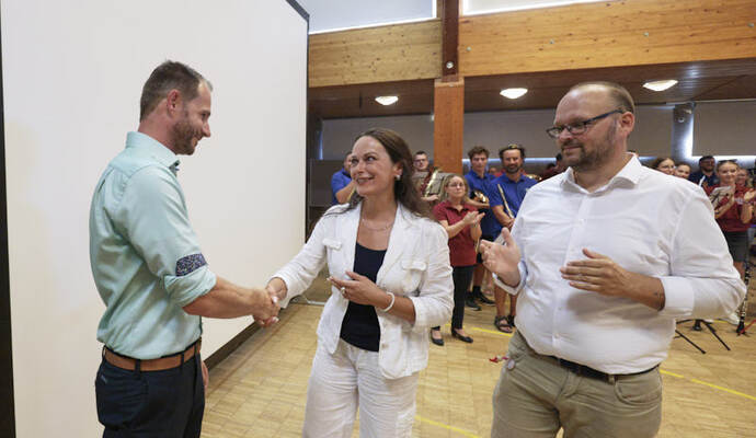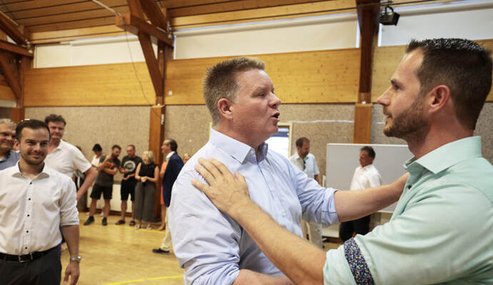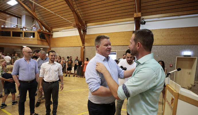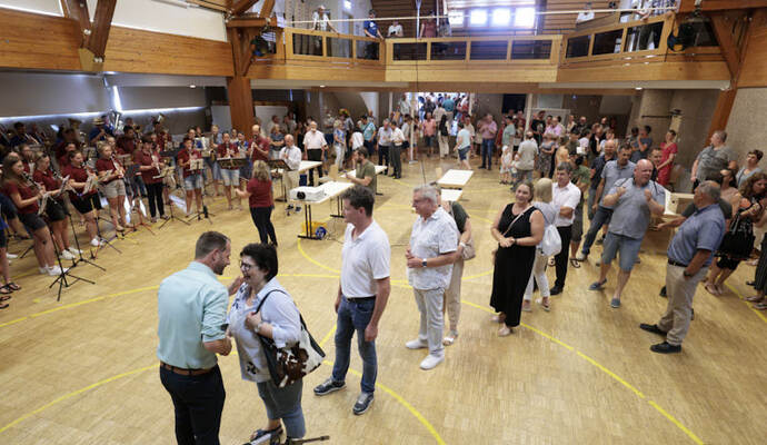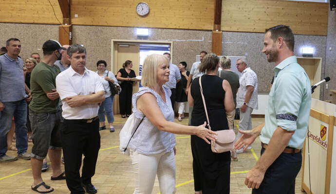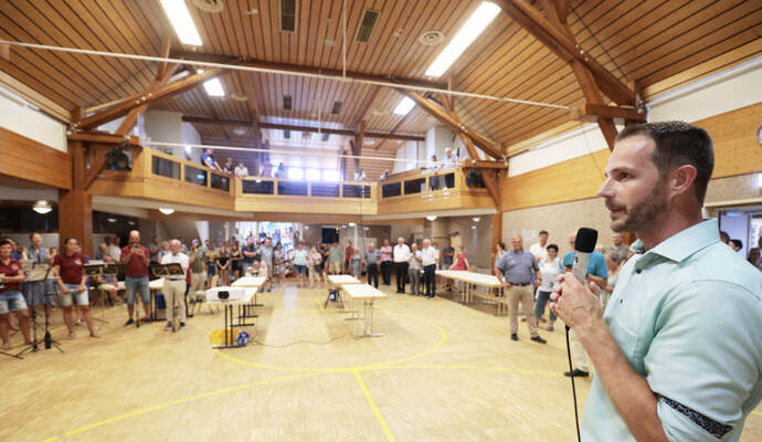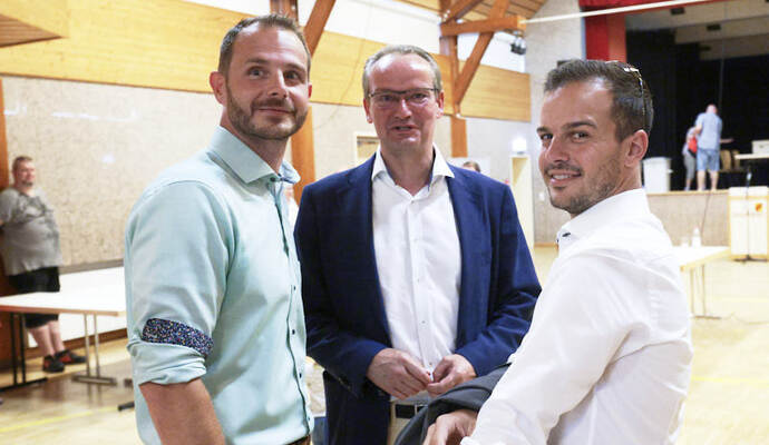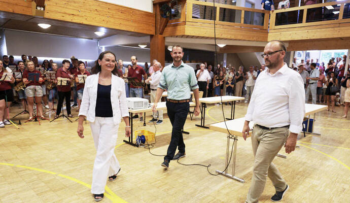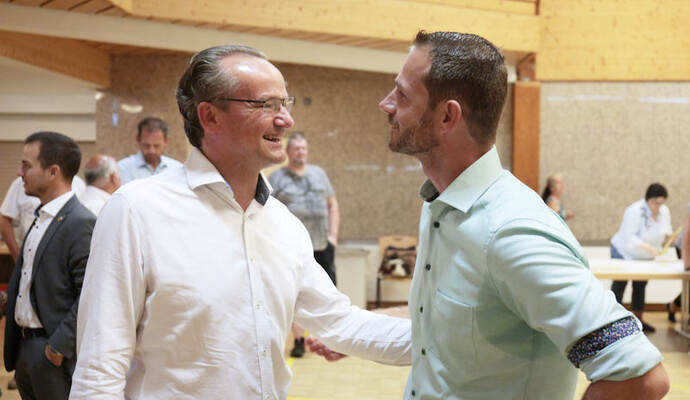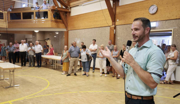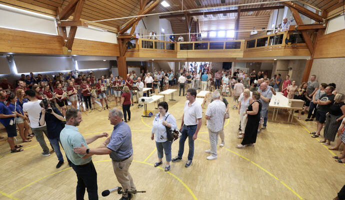 Die Turn- und Festhalle füllte sich schnell am Sonntagabend. Während Maag auf eine Entscheidung im ersten Wahlgang hoffte, hielt Giek dies eher für unwahrscheinlich: „Ich denke nicht, dass sich da heute jemand so deutlich absetzen kann.“ Lange mussten die Kandidierenden nicht auf das Ergebnis warten, das der scheidende Amtsinhaber Udo Kleiner verkündete, der den fairen Wahlkampf lobte und Maag unter großem Applaus zum neuen Bürgermeister der Gemeinde
