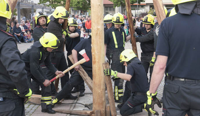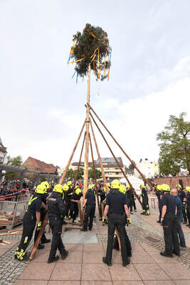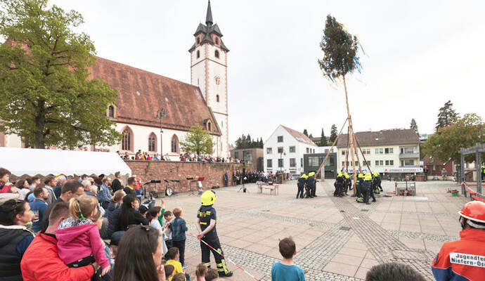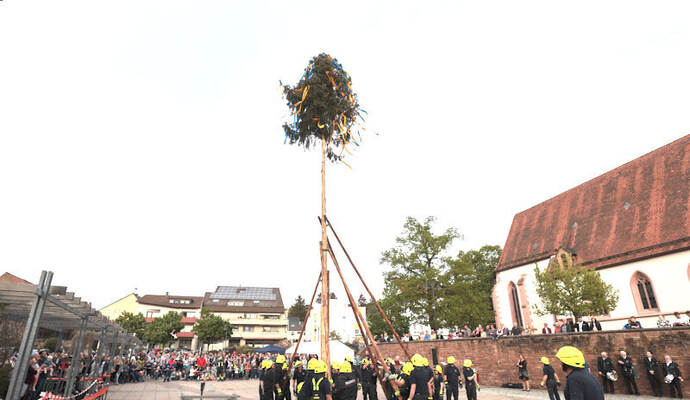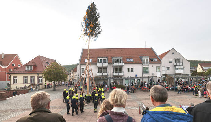 Auch in Niefern wurde ein Maibaum auf dem Marktplatz aufgestellt. Zahlreiche Zuschauer begleiteten das Spektakel und ließen den Abend mit Bier und Grillwurst ausklingen.
