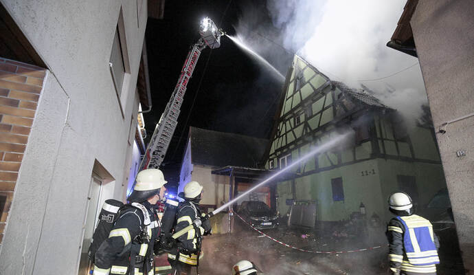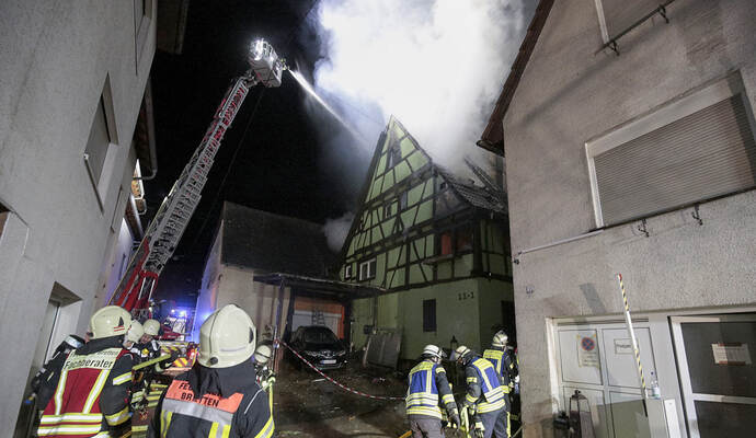Gegen 1.50 Uhr wurde die Feuerwehr zu einem Brand in die Hintere Dorfstraße gerufen. Im Erdgeschoss des frei stehenden Fachwerkhauses war der Brand wohl ausgebrochen. Für die Löscharbeiten musste eine angrenzende Bahnstrecke zwischen Bruchsal und Mühlacker zeitweise gesperrt werden. Das Haus selbst sei wohl nicht mehr zu retten, sagte ein Sprecher. Auch Anwohner umliegender Häuser hätten vorsorglich ihre Wohnungen verlassen.