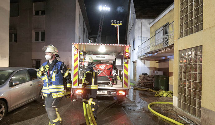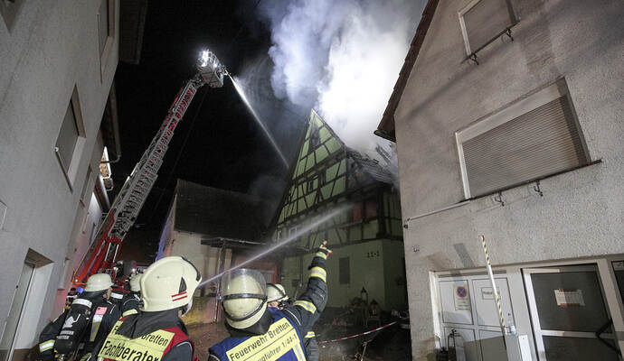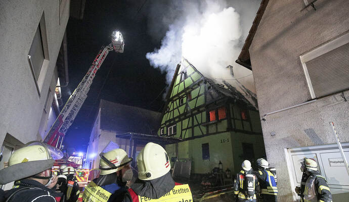 Bretten. Bei einem Brand in einem Fachwerkhaus in Bretten sind am Mittwochmorgen zwei Feuerwehrleute leicht verletzt worden. Die Bewohner hätten das Haus unbeschadet verlassen können, teilte die Polizei mit.